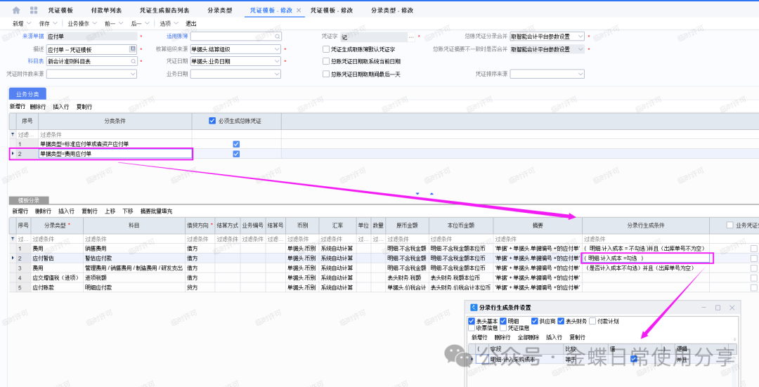3、分錄行生成條件 ① 可以理解為生成該行分錄的前提條件;為空則表示無(wú)條件生成;單據(jù)上的所有字段均可以作為分錄行生成條件的判斷依據(jù)。 ② 舉例說(shuō)明:應(yīng)付單——費(fèi)用應(yīng)付單分錄上有個(gè)【計(jì)入成本】復(fù)選框,是否計(jì)入成本在賬務(wù)處理時(shí)要求進(jìn)不同的科目,計(jì)入成本沖減應(yīng)付暫估科目,不計(jì)入成本則進(jìn)費(fèi)用科目;那么在設(shè)置憑證模板時(shí)就應(yīng)該這么設(shè)置:一條分錄的借應(yīng)付暫估,分錄行生成條件是計(jì)入成本,另一條分錄是借費(fèi)用,分錄行生成條件是不計(jì)入成本。單據(jù)生成憑證是系統(tǒng)會(huì)自動(dòng)判斷滿足哪個(gè)分錄行生成條件從而生成對(duì)應(yīng)的分錄。 4、分錄類型與科目: ①在憑證模板上引用分錄類型后,會(huì)將分錄類型上的科目攜帶過(guò)來(lái),用戶可以進(jìn)行修改;最后生成憑證取的是【科目設(shè)置-修改】界面的科目。 ②科目核算維度維度來(lái)源,會(huì)默認(rèn)帶出科目上的維度,比如截圖中的管理費(fèi)用,設(shè)置了“部門(mén)”及“費(fèi)用項(xiàng)目”作為核算維度;“取單據(jù)上的字段”中需要進(jìn)行選擇,這樣生成憑證時(shí)才會(huì)帶出核算維度。 ③科目影響因素來(lái)源,則因?yàn)樵O(shè)置了科目影響因素設(shè)置,需要選擇字段作為判斷字段的來(lái)源。 5、金額(含原幣金額、本位幣金額): ① 若模板分錄的金額設(shè)置取的是表頭字段,模板分錄的其它要素(科目影響因素來(lái)源、核算維度、幣別、摘要、結(jié)算方式、結(jié)算號(hào)、分錄行生成條件)也應(yīng)該設(shè)置成取表頭字段;若金額取表頭字段,其它要素取表體字段,可能會(huì)導(dǎo)致取不到值甚至引起憑證生成中斷。 ② 若模板分錄的金額取的是表體字段,模板分錄的其它要素(例如科目影響因素來(lái)源、核算維度、幣別、摘要、結(jié)算方式、結(jié)算號(hào)、分錄行生成條件)可以設(shè)置成取表頭字段可以設(shè)置成表體字段。 總結(jié):一行分錄中的內(nèi)容來(lái)源要么取單據(jù)頭,要么取單據(jù)體的同一個(gè)頁(yè)簽字段,若跨頁(yè)簽會(huì)無(wú)法保存。 注意:系統(tǒng)預(yù)置的憑證模板是根據(jù)預(yù)置的新會(huì)計(jì)準(zhǔn)則科目和預(yù)置的業(yè)務(wù)流程來(lái)進(jìn)行設(shè)置的;客戶實(shí)際應(yīng)用時(shí),科目和實(shí)際流程一旦修改,系統(tǒng)預(yù)置的憑證模板也就不適用了,必須進(jìn)行相應(yīng)修改或另行配置。 閱讀原文:原文鏈接 點(diǎn)晴模切ERP更多信息:http://moqie.clicksun.cn,聯(lián)系電話:4001861886 該文章在 2025/8/15 12:37:01 編輯過(guò) |