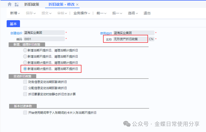2.在【固定資產(chǎn)】→【折舊政策】中新增無形資產(chǎn)折舊政策:新增當期計提折舊,清理當期不提折舊;