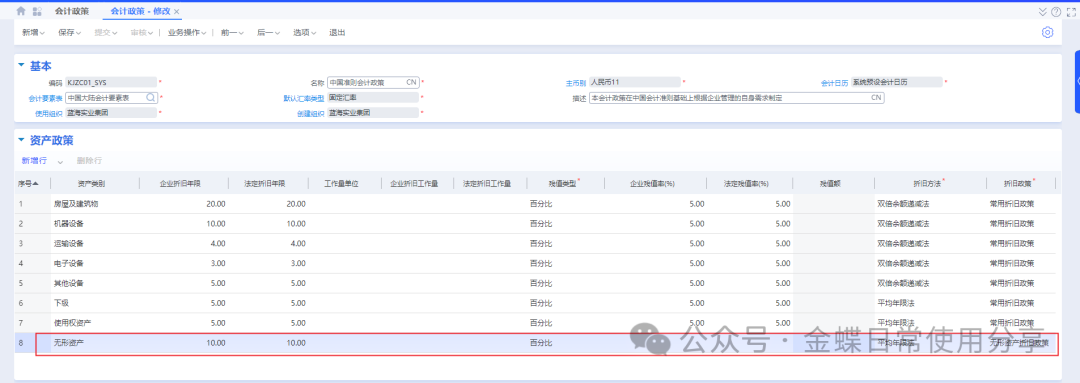 3.打開【固定資產(chǎn)】→【會計政策】,在【資產(chǎn)政策】頁簽新增行,資產(chǎn)類別選擇“無形資產(chǎn)“,折舊政策選擇”無形資產(chǎn)的折舊政策“。