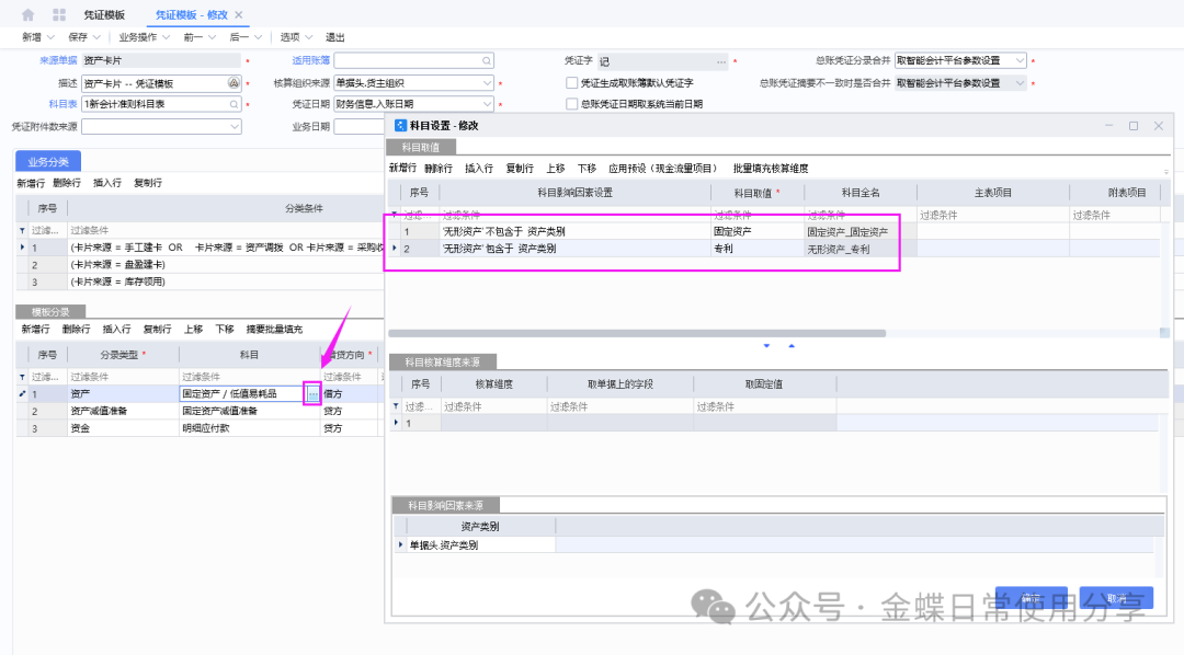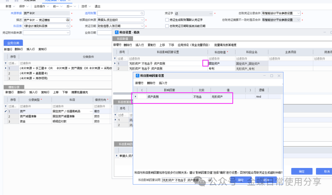5、資產(chǎn)卡片和折舊調(diào)整單的憑證模板需要按照資產(chǎn)類別區(qū)分設置一下。