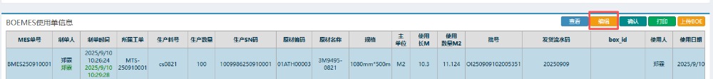 5.提交之后,回到左側(cè)功能菜單找到“MES組件使用單出庫(kù)”。 6.點(diǎn)擊打開(kāi)后,點(diǎn)擊查詢(xún)。如果沒(méi)有找到單子可以填編碼或者名稱(chēng)篩選。 7.查詢(xún)之后,按圖操作:先點(diǎn)擊對(duì)應(yīng)使用單進(jìn)行確認(rèn),然后再進(jìn)行上傳BOE。 ![]() 如果確認(rèn)后發(fā)現(xiàn)有其他問(wèn)題或者需要修改的話(huà),可以點(diǎn)擊對(duì)應(yīng)使用單,點(diǎn)擊“編輯”,然后駁回。重新按照上述流程操作。