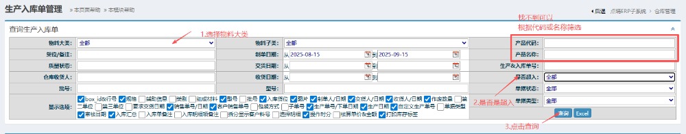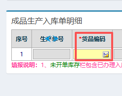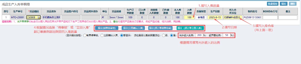 ![]() ![]() 1.進(jìn)入ERP系統(tǒng)之后,點(diǎn)擊“BOE定制”,點(diǎn)開“正常加工”,然后找到“新增成品生產(chǎn)入庫單”。 2.進(jìn)入界面后,按圖操作:選擇好對應(yīng)入庫倉庫。備注可根據(jù)情況填寫。 3.接著點(diǎn)擊下方的“貨品編碼”,會彈出物料的信息界面。 彈出界面后,按圖操作:選擇訂單來源,然后點(diǎn)擊查詢,點(diǎn)擊對應(yīng)的物料信息。 如果找不到可根據(jù)代碼或名稱篩選。 4.選好物料后,按圖操作:填寫入庫數(shù)量、日期以及入庫倉庫(與上面一致)。 根據(jù)情況選擇“待審核”或者“立即入庫”。如果有超入的情況下,需要設(shè)置好超入的比例。 超入:指超出入庫訂單指定的數(shù)量。 5.提交之后,回到左側(cè)功能菜單,點(diǎn)擊“成品入庫單管理”。 6.點(diǎn)擊進(jìn)入后,按圖操作:選擇訂單大類,是否是超入的訂單,然后點(diǎn)擊查詢(找不到可以根據(jù)代碼或名稱篩選)。