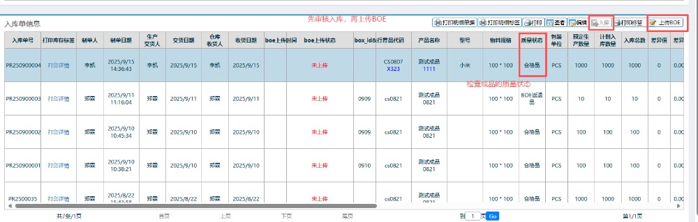 7.接下來就是進(jìn)行入庫的操作:先入庫,再上傳BOE。同時檢查下成品的質(zhì)量狀態(tài)。 流程結(jié)束。 備注:如果成品質(zhì)量狀態(tài)為“BOE材損品”,接下來的流程跳轉(zhuǎn)到這里: 點(diǎn)晴ERP-BOE材損原材轉(zhuǎn)換流程