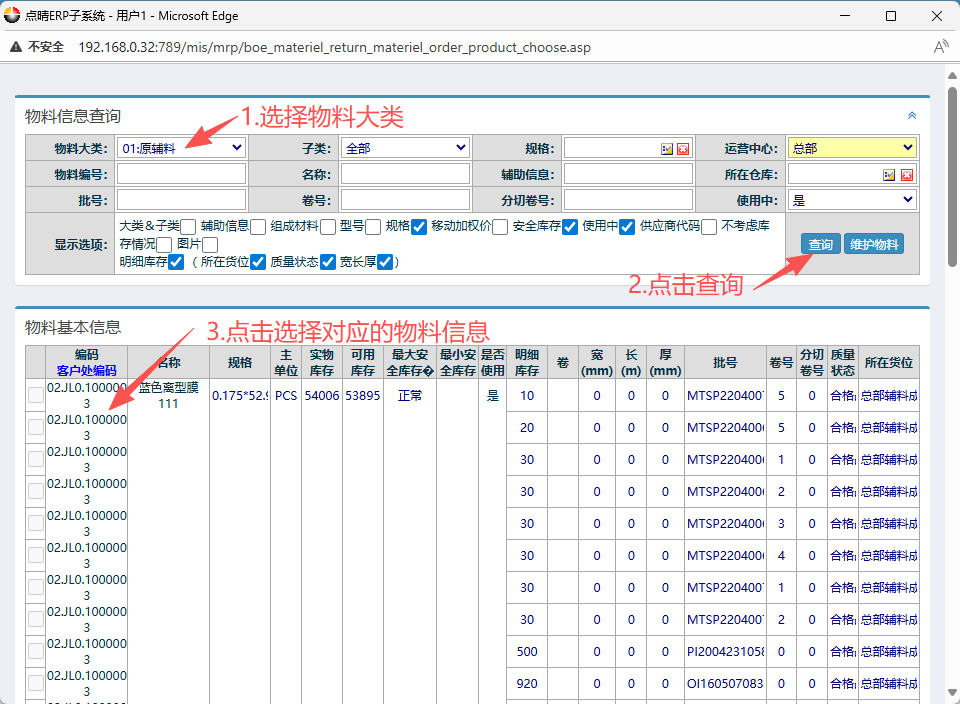 2.進(jìn)入界面之后,點(diǎn)擊選擇發(fā)貨倉庫,備注有需要可以補(bǔ)充。 3.接著來到下方點(diǎn)擊“物料編碼”,會(huì)彈出物料信息窗口。 在彈出窗口內(nèi),按圖操作:點(diǎn)擊選擇物料大類,點(diǎn)擊查詢。然后點(diǎn)擊對(duì)應(yīng)的物料信息。 注:如果找不到物料信息可輸入編號(hào)或名稱篩選。 4.選好物料后,檢查并確認(rèn)物料信息,根據(jù)情況提交選擇“制單待退料”或“立即退料” 5.提交后,回到左側(cè)功能菜單找到“退料到BOE出庫單管理” 6.進(jìn)入界面后,按圖操作:可用代碼或名稱查找,點(diǎn)擊查詢。然后點(diǎn)擊對(duì)應(yīng)物料信息,先進(jìn)行出庫,再上傳BOE。 流程結(jié)束。 點(diǎn)晴模切ERP更多信息:http://moqie.clicksun.cn,聯(lián)系電話:4001861886 該文章在 2025/10/20 10:33:19 編輯過 |