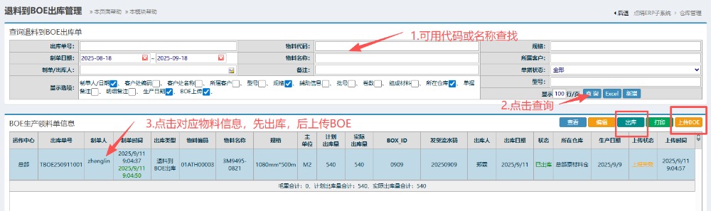 點(diǎn)晴模切ERP-退料到BOE出庫單流程