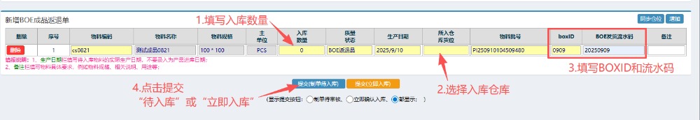 4.  選好物料后,按圖操作:填寫入庫數(shù)量,選擇入庫倉庫(要與上面一致),填寫BOXID和流水碼。根據(jù)情況選擇提交“待入庫”或“立即入庫”。