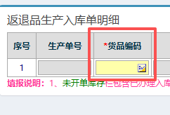 2.進入界面后,按圖操作:點擊選擇入庫倉庫,備注可根據(jù)情況補充。 3.接下來下方點擊“貨品編碼”,會彈出物料信息窗口。 在彈窗的物料信息窗口內,選擇訂單來源,點擊查詢。然后點擊對應物料信息。 4.選好物料之后,按圖操作:填寫入庫數(shù)量、日期以及入庫倉庫(要與上面一致)。然后提交選擇“制單待審核”或“立即入庫”。 注:超訂單是指超出訂單內指定的數(shù)量 5.提交之后,回到左側功能菜單里找到“返退品生產(chǎn)入庫管理” 6.進入界面后,按圖操作:點擊選擇物料大類,點擊查詢。然后點擊對應物料信息,先進行入庫,再上傳BOE。 ![]()