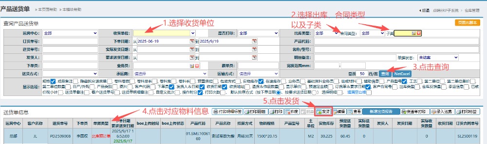 ![]() ![]() 1.進(jìn)入ERP系統(tǒng)之后,在左側(cè)的功能菜單里找到“BOE定制”,點(diǎn)開“成品返退”,點(diǎn)擊“新增返退品送貨單”。 2.進(jìn)入界面后,按圖操作:點(diǎn)擊選擇送貨類型,然后選擇對(duì)應(yīng)客戶。 3.接著到下方點(diǎn)擊“物料編碼”,會(huì)彈出物料信息窗口。 在彈出的物料信息窗口內(nèi),選擇物料大類,點(diǎn)擊查詢。然后點(diǎn)擊對(duì)應(yīng)物料信息。 4.選好物料后,填寫發(fā)貨數(shù)量以及發(fā)貨單價(jià),然后點(diǎn)擊提交。 5.提交后,回到左側(cè)的功能菜單找到“返退品送貨單管理”。 6.進(jìn)入界面后,按圖操作:選擇收貨單位、出庫和合同類型以及子類,點(diǎn)擊查詢。然后點(diǎn)擊對(duì)應(yīng)物料信息,再點(diǎn)擊發(fā)貨。 在發(fā)貨界面內(nèi),按圖操作:填寫實(shí)際發(fā)貨數(shù)量以及發(fā)貨倉庫(與上面一致),根據(jù)情況選擇“確認(rèn)送貨數(shù)量”或“送貨并回單”。