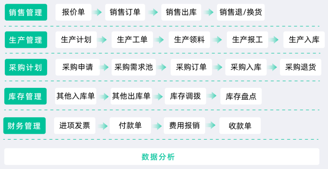 • 后來(lái)才慢慢擴(kuò)展到采購(gòu)、銷(xiāo)售、生產(chǎn)、庫(kù)存。