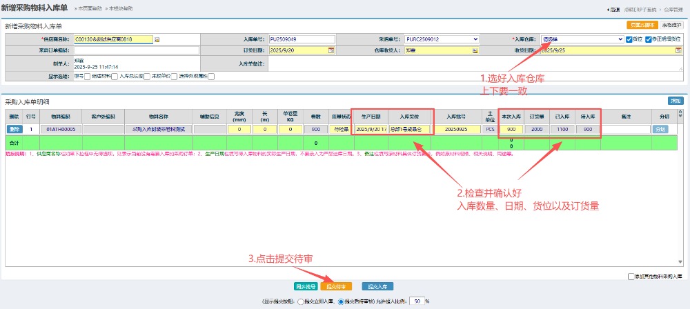 ![]() ![]() 1.登錄并進(jìn)入ERP系統(tǒng)內(nèi)。輸入用戶名和密碼。 2.進(jìn)入ERP系統(tǒng)之后,在左側(cè)或者上方的菜單內(nèi)點(diǎn)擊“ERP”。 然后進(jìn)入后,點(diǎn)擊左側(cè)或者上方的菜單內(nèi)“倉庫管理”,再點(diǎn)開“采購入庫管理”,點(diǎn)擊“采購入庫計(jì)劃”。 3.進(jìn)入“采購入庫計(jì)劃”頁面后,先點(diǎn)擊查詢,然后點(diǎn)擊選中對(duì)應(yīng)單據(jù),在右邊點(diǎn)擊入庫。 進(jìn)入入庫界面,先選擇好入庫倉庫,然后確認(rèn)好物料的入庫數(shù)量、訂貨量和日期,點(diǎn)擊提交待審。 有多物料入庫的話可以在右邊點(diǎn)擊增加。