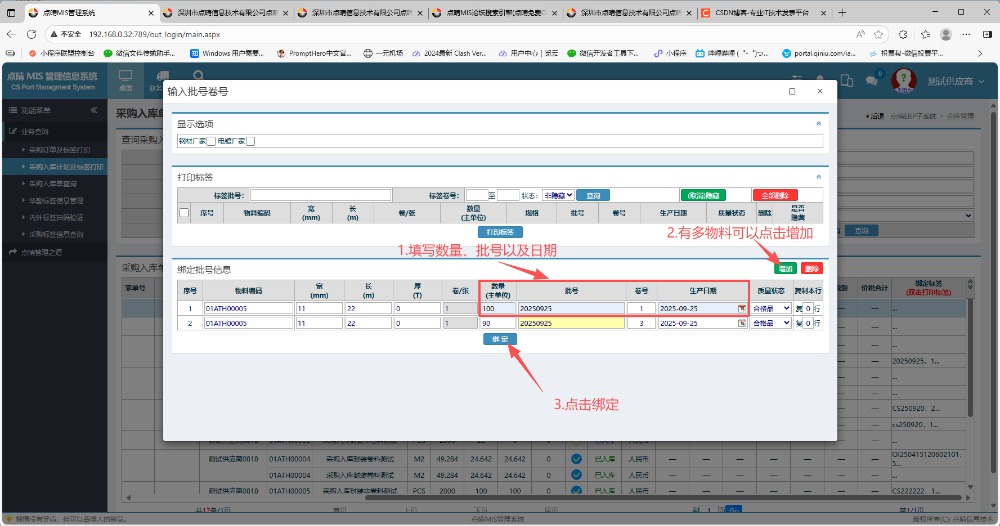 ![]() 4.然后退出當(dāng)前系統(tǒng)的賬號(hào),登錄供應(yīng)商賬號(hào)。 5.進(jìn)入系統(tǒng)之后,在左側(cè)功能菜單里點(diǎn)擊“采購入庫計(jì)劃及標(biāo)簽打印” 6.進(jìn)入界面后,點(diǎn)擊查詢,然后找到對(duì)應(yīng)入庫單點(diǎn)擊并拉到最右邊雙擊打印標(biāo)簽,會(huì)彈出信息窗口。 在彈出的信息窗口內(nèi),填寫數(shù)量和日期。如果有多物料的話可以在右邊點(diǎn)擊增加,然后點(diǎn)擊綁定。 綁定之后,在頁面內(nèi)左手邊選好對(duì)應(yīng)物料進(jìn)行勾上,點(diǎn)擊打印標(biāo)簽。 7.在二維碼標(biāo)簽界面內(nèi),模板選擇“test”,點(diǎn)擊打印標(biāo)簽。然后就會(huì)彈出打印預(yù)覽界面。 ![]() 8.進(jìn)入到打印預(yù)覽頁面后,在手機(jī)打開“點(diǎn)晴業(yè)務(wù)通app”,點(diǎn)擊“按采購入庫單掃碼確認(rèn)” 9.手機(jī)點(diǎn)擊“按采購入庫單掃碼確認(rèn)”進(jìn)去后,點(diǎn)擊“攝像頭”,對(duì)剛才的打印預(yù)覽界面內(nèi)的二維碼進(jìn)行掃碼操作。 然后手機(jī)app內(nèi)下方就會(huì)顯示采購入庫信息明細(xì),接著要記得選擇入庫倉庫,最后點(diǎn)擊確認(rèn)入庫。 10.回到“采購入庫計(jì)劃及打印標(biāo)簽”頁面,再次點(diǎn)擊查詢,可以看到剛才掃碼的物料已經(jīng)成功入庫了。 點(diǎn)晴模切ERP更多信息:http://moqie.clicksun.cn,聯(lián)系電話:4001861886 該文章在 2025/9/25 15:45:50 編輯過 |