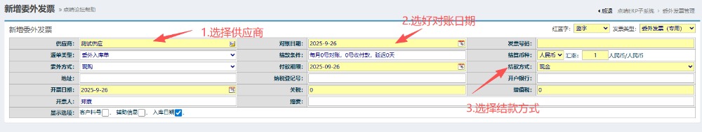 2.進入界面后,按圖操作:先選擇供應商,填好對賬日期以及選好結款方式。