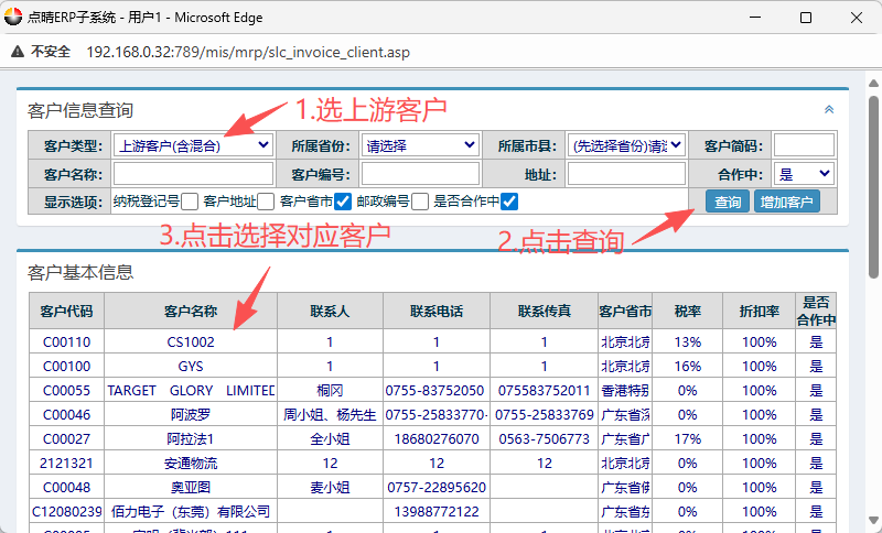 點擊供應商后會彈出客戶信息窗口界面,按圖操作:選上游客戶,點擊查詢。然后點擊選擇對應的客戶。