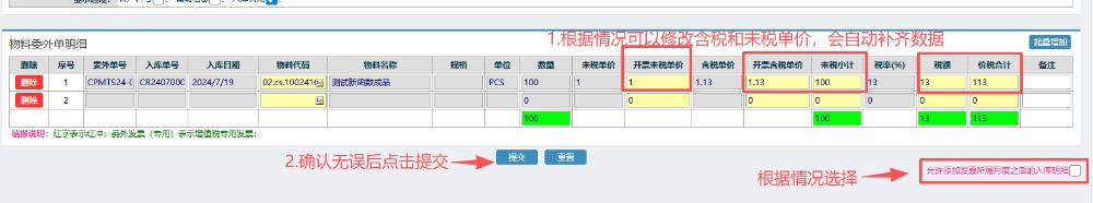 4.選好對應發(fā)票明細后,可以根據情況修改含稅和未稅的單價,確認無誤后點擊提交。