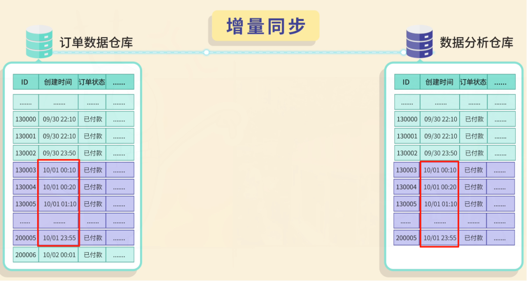 這就是 增量同步,約定每天 0 點(diǎn)執(zhí)行同步任務(wù),只同步昨天 0 點(diǎn)之后創(chuàng)建的訂單。
