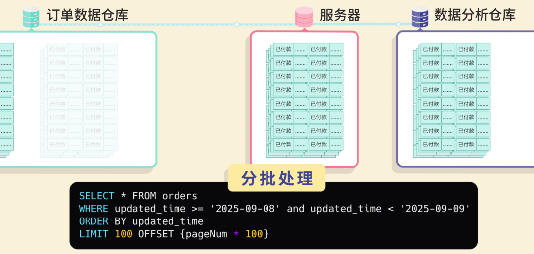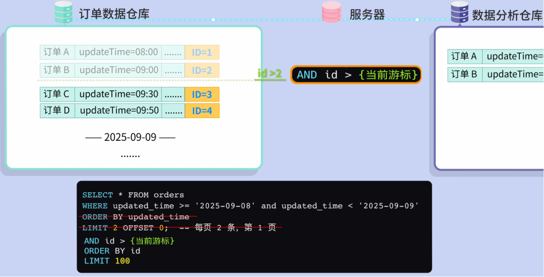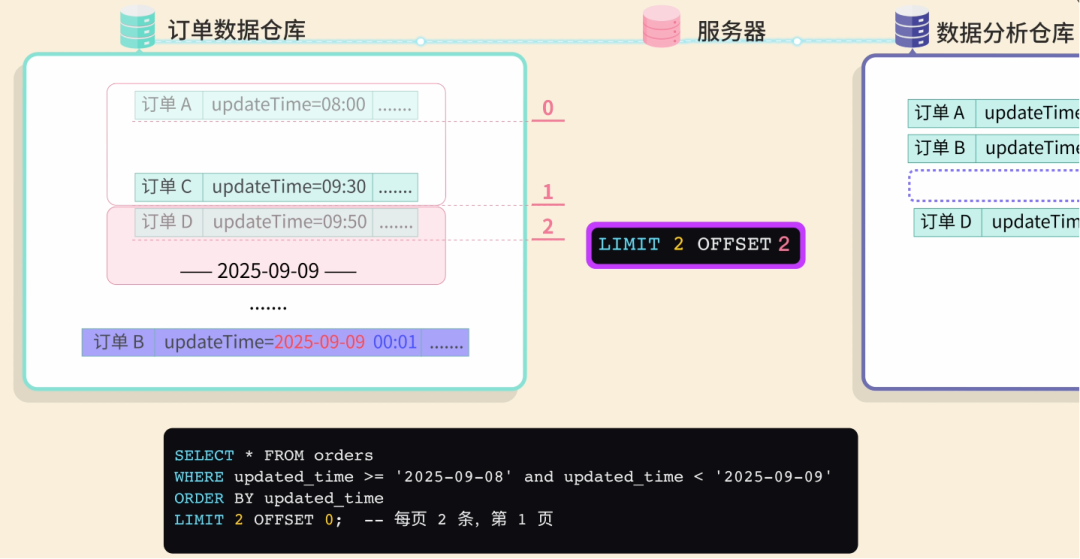 查詢結(jié)果返回訂單 A(08:00)和訂單 B(09:00),同步完成后將偏移量調(diào)整為下一頁(yè) OFFSET=2。