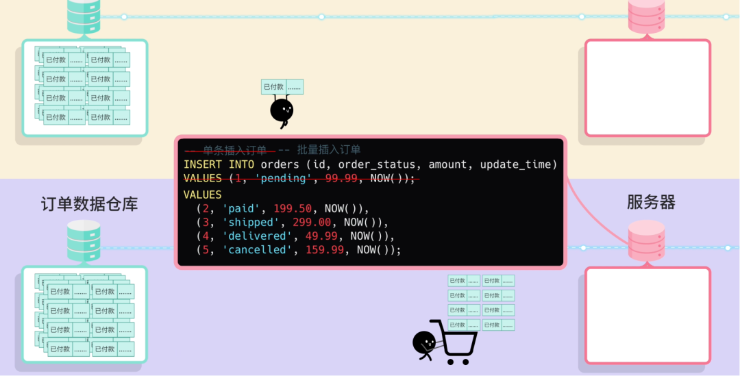 首先,修改插入數(shù)據(jù)庫(kù)的操作方式。之前是一條一條地插入訂單數(shù)據(jù),改為執(zhí)行一條批處理語(yǔ)句來(lái)同時(shí)插入同一批內(nèi)多個(gè)訂單數(shù)據(jù),減少了跟數(shù)據(jù)庫(kù)通信的次數(shù),性能大幅提升。