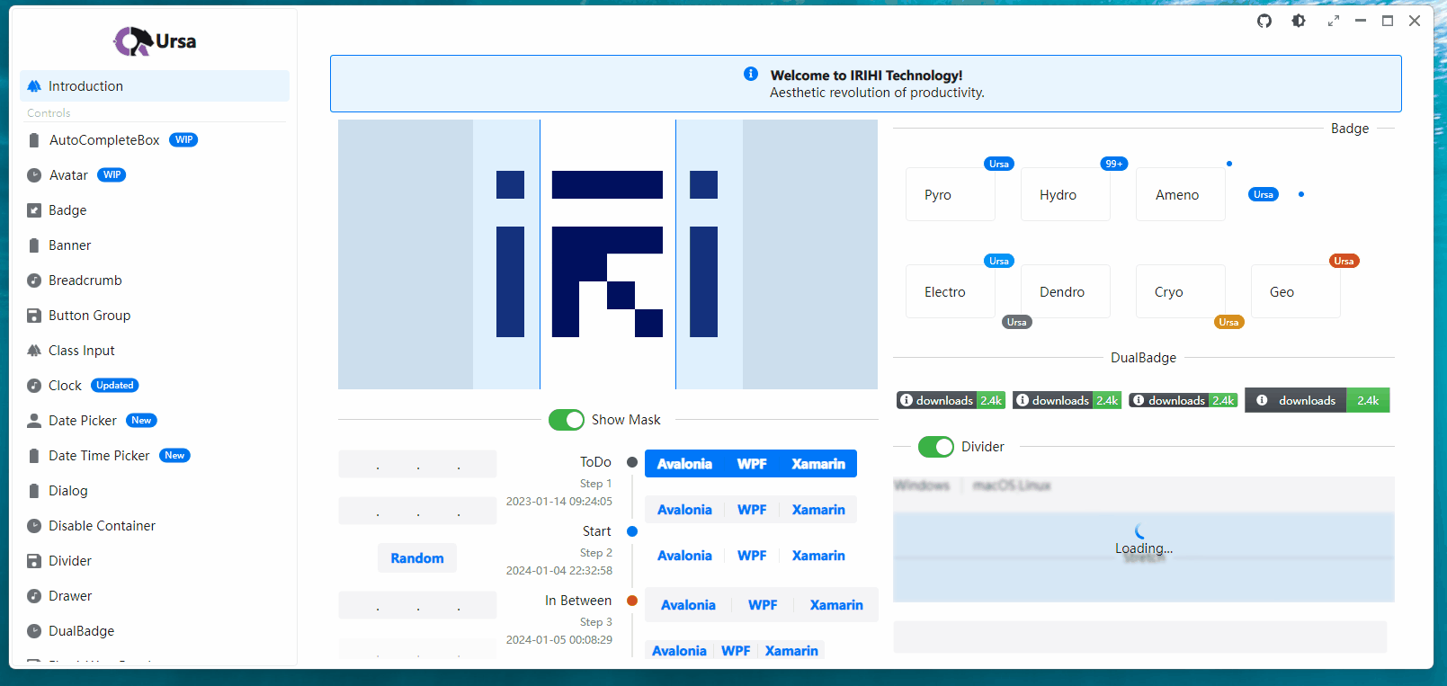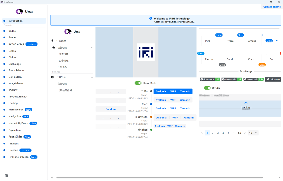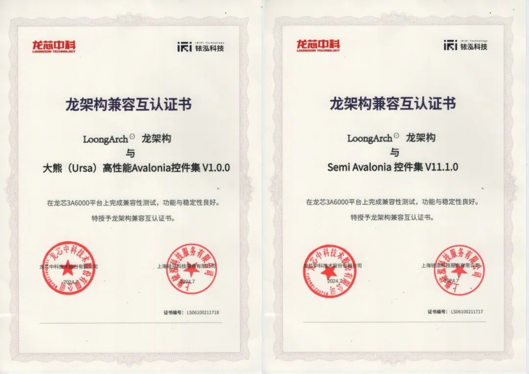 Avalonia是什么?Avalonia是一個(gè)強(qiáng)大的框架,使開發(fā)人員能夠使用.NET創(chuàng)建跨平臺(tái)應(yīng)用程序。它使用自己的渲染引擎繪制UI控件,確保在Windows、macOS、Linux、Android、iOS和WebAssembly等不同平臺(tái)上具有一致的外觀和行為。這意味著開發(fā)人員可以共享他們的UI代碼,并在不同的目標(biāo)平臺(tái)上保持統(tǒng)一的外觀和感覺。 Dotnet和Avalonia都是MIT協(xié)議,相關(guān)的代碼地址是: Semi.Avalonia和Ursa.Avalonia(一)Semi.Avalonia - 主題風(fēng)格的魅力實(shí)現(xiàn)Semi.Avalonia,這是以 MIT 協(xié)議開源的 Avalonia UI 框架下的 Semi Design 主題風(fēng)格的精妙呈現(xiàn)。它為應(yīng)用程序帶來獨(dú)特的視覺風(fēng)格,如同一幅精美的畫卷,為用戶界面增添了豐富的色彩和質(zhì)感。 其倉(cāng)庫(kù)地址為:https://github.com/irihitech/Semi.Avalonia (二)Ursa.Avalonia - 自定義控件的創(chuàng)新力量搭配同樣遵循 MIT 協(xié)議的Ursa.Avalonia自定義控件庫(kù),更是如虎添翼。它們攜手為開發(fā)者締造全新的視覺與功能體驗(yàn),仿佛為開發(fā)之旅開啟了一扇通往無限可能的大門。 倉(cāng)庫(kù)地址:https://github.com/irihitech/Ursa.Avalonia 在信創(chuàng)及國(guó)產(chǎn)操作系統(tǒng)領(lǐng)域表現(xiàn)值得一提的是,這兩個(gè)庫(kù)在信創(chuàng)及國(guó)產(chǎn)操作系統(tǒng)領(lǐng)域表現(xiàn)出色,已完成與龍芯 3A6000 和龍架構(gòu)(LoongArch?)的兼容互認(rèn)證,這是自主可控和國(guó)產(chǎn)化技術(shù)推進(jìn)的重要成果。 下面信息引用來自微信公眾號(hào)【銥泓科技】8月2號(hào)的文章 《Ursa與Semi正式完成龍架構(gòu)兼容互認(rèn)證》: