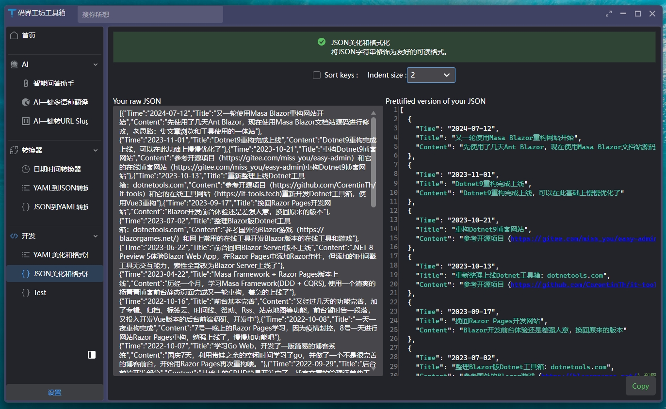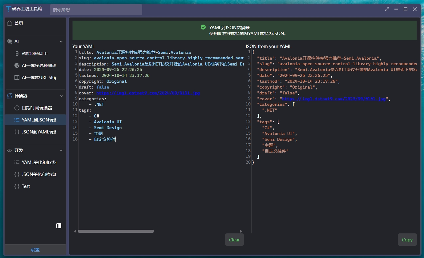 控件部分截圖控件雖各有特色,但都展現(xiàn)出獨(dú)特的魅力。簡(jiǎn)單截取幾張圖,讓您一窺其貌: Semi.Avalonia主題庫(kù)一覽: Ursa.Avalonia自定義控件庫(kù)一覽: 實(shí)際案例分享站長(zhǎng)公司項(xiàng)目使用了該控件,雖不便截圖展示,但可參考站長(zhǎng)使用 Avalonia UI 搭配該主題及控件庫(kù)編寫的工具CodeWF.Toolbox: 倉(cāng)庫(kù):https://github.com/dotnet9/CodeWF.Toolbox 該小工具使用Avalonia+Prism 8模塊化開發(fā),AOT 發(fā)布后的文件組織結(jié)構(gòu): 其具備黑白主題,營(yíng)造出不同的視覺氛圍: ![]() ![]() 還實(shí)現(xiàn)了國(guó)際化功能,為全球用戶提供便捷體驗(yàn): 同時(shí),包含實(shí)用的 Json 美化工具和 YAML 轉(zhuǎn) Json 工具,分別如下圖所示: Json 美化工具 YAML轉(zhuǎn)Json工具 使用經(jīng)驗(yàn)分享
