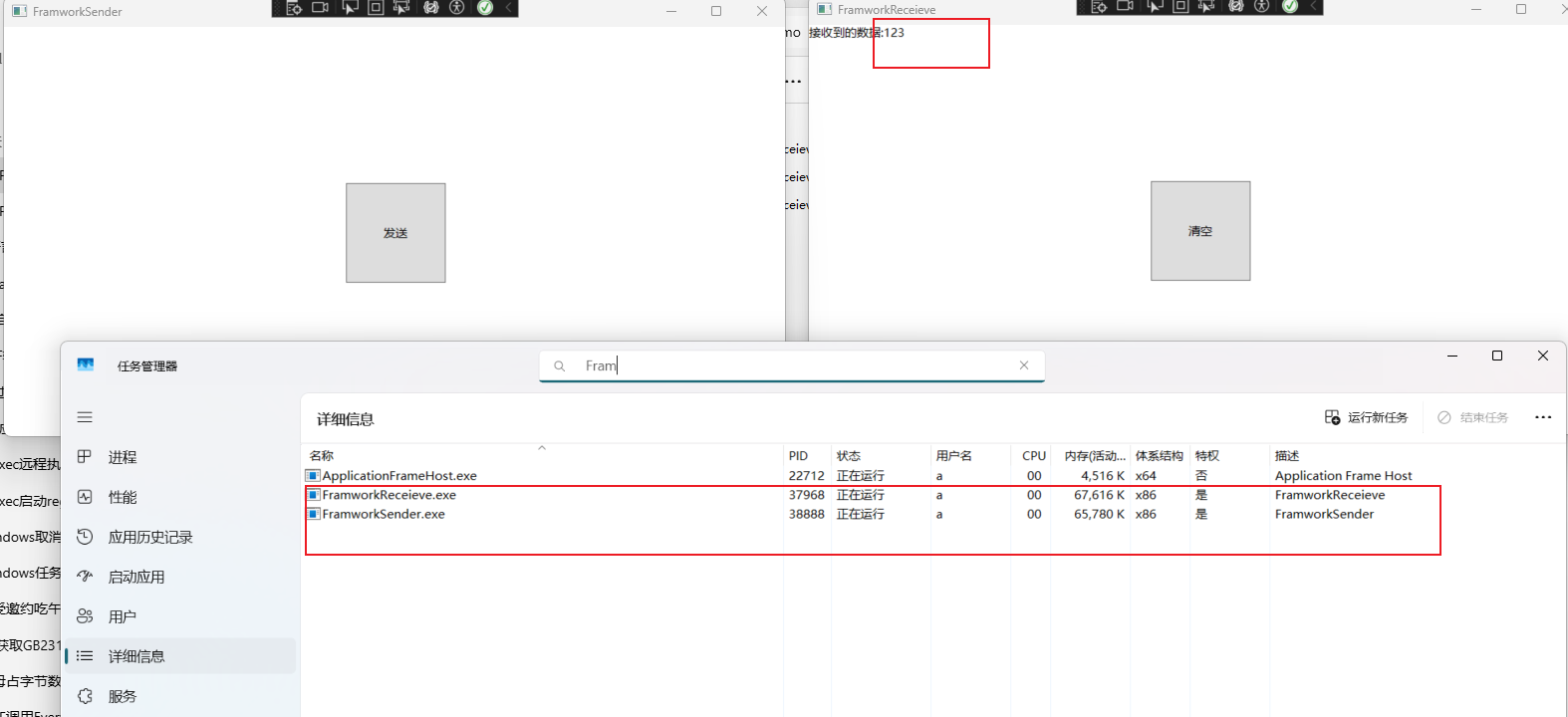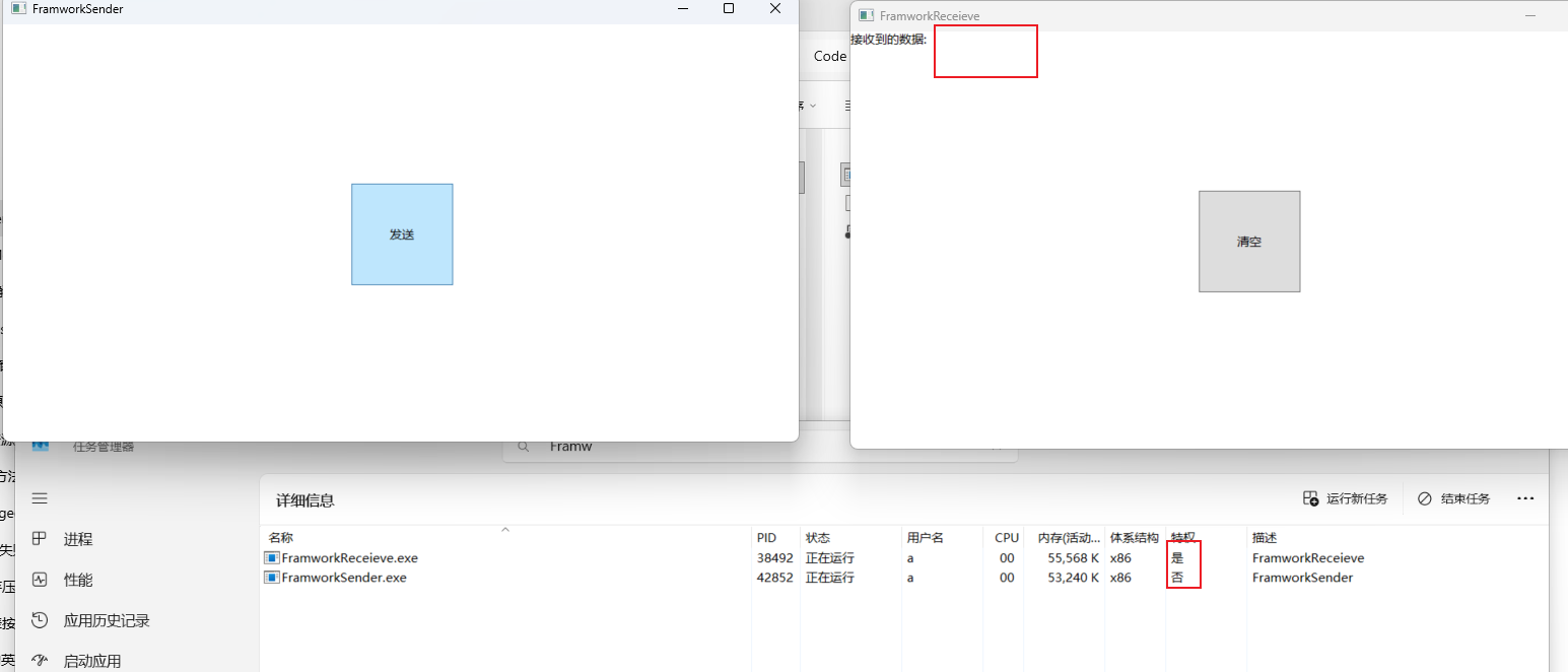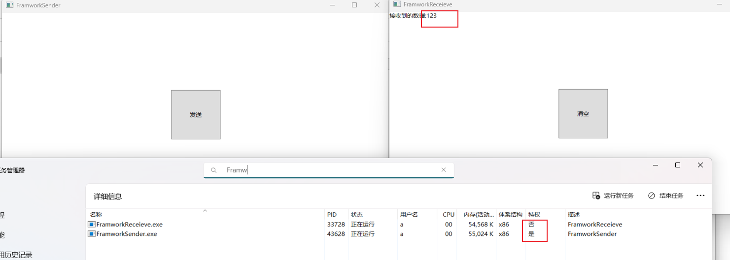 2、倆個進(jìn)程都是普通權(quán)限的,是可以接受到數(shù)據(jù) 3、發(fā)送端是管理員權(quán)限,接收端是 普通權(quán)限,是可以接受到數(shù)據(jù)