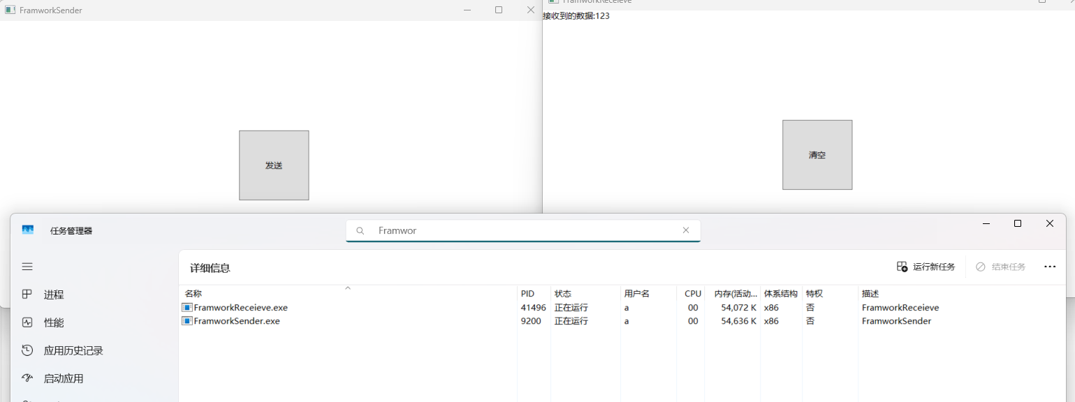 二、創(chuàng)建一個WPF 消息 的接收端 <Window x:Class="FramworkReceieve.MainWindow" xmlns="http://schemas.microsoft.com/winfx/2006/xaml/presentation" xmlns:x="http://schemas.microsoft.com/winfx/2006/xaml" xmlns:d="http://schemas.microsoft.com/expression/blend/2008" xmlns:mc="http://schemas.openxmlformats.org/markup-compatibility/2006" xmlns:local="clr-namespace:FramworkReceieve" mc:Ignorable="d" Title="FramworkReceieve" Height="450" Width="800"> <Grid> <StackPanel Orientation="Horizontal"> <TextBlock Text="接收到的數(shù)據(jù):"/> <TextBlock Text="" x:Name="txtMessage"/> </StackPanel> <Button Height="100" Width="100" Content="清空" Click="ButtonBase_OnClick"></Button> </Grid> </Window> /// <summary> /// MainWindow.xaml 的交互邏輯 /// </summary> public partial class MainWindow : Window { public MainWindow() { InitializeComponent(); Loaded += MainWindow_Loaded; } private uint _customMessageId; private HwndSource _hwndSource; private void MainWindow_Loaded(object sender, RoutedEventArgs e) { _customMessageId = RegisterWindowMessage("MyApp"); // 獲取窗口句柄并添加消息鉤子 _hwndSource = PresentationSource.FromVisual(this) as HwndSource; _hwndSource?.AddHook(WndProc); } [MarshalAs(UnmanagedType.ByValTStr, SizeConst = 16)] public string content; private IntPtr WndProc(IntPtr hwnd, int msg, IntPtr wParam, IntPtr lParam, ref bool handled) { #region CopyData if (msg == WM_COPYDATA) { COPYDATASTRUCT cds = (COPYDATASTRUCT)Marshal.PtrToStructure(lParam, typeof(COPYDATASTRUCT)); string receivedMessage = Marshal.PtrToStringUni(cds.lpData); this.Dispatcher.Invoke(() => { txtMessage.Text = receivedMessage; }); handled = true; } #endregion return IntPtr.Zero; } #region RegisterWindows [DllImport("user32.dll", CharSet = CharSet.Auto, SetLastError = true)] private static extern uint RegisterWindowMessage(string lpString); #endregion #region CopyData public const int WM_COPYDATA = 0x004A; // 定義 COPYDATASTRUCT 結(jié)構(gòu) [StructLayout(LayoutKind.Sequential)] public struct COPYDATASTRUCT { public IntPtr dwData; public int cbData; public IntPtr lpData; } #endregion protected override void OnClosed(EventArgs e) { _hwndSource?.RemoveHook(WndProc); base.OnClosed(e); } private void ButtonBase_OnClick(object sender, RoutedEventArgs e) { txtMessage.Text = ""; } }