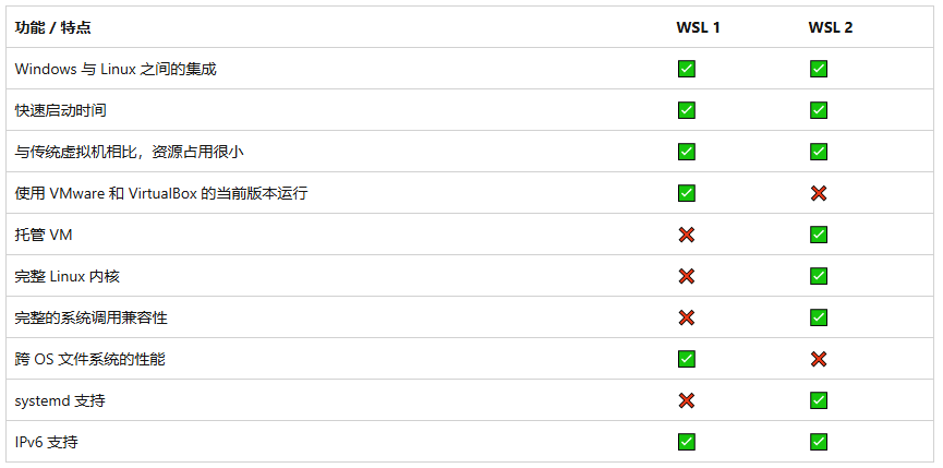 ?注意事項(xiàng)?:WSL2僅支持Windows 10版本1903版本18362或更高版本中可用(通過(guò)選擇 Windows 徽標(biāo)鍵 + R 來(lái)檢查 Windows 版本,鍵入 winver,選擇“確定”),WSL1支持范圍更廣但功能受限。?對(duì)于低于 14393 的版本,WSL 根本不支持。下表列出了兩種版本的主要特性對(duì)比。