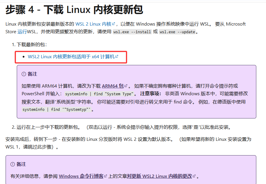 在Windows 10上如果默認(rèn)版本是WSL1,可以手動(dòng)下載更新包對(duì)其升級(jí),如下圖所示: