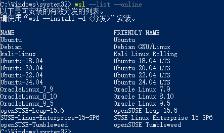 wsl --list --online:列出可用的Linux分發(fā)版。