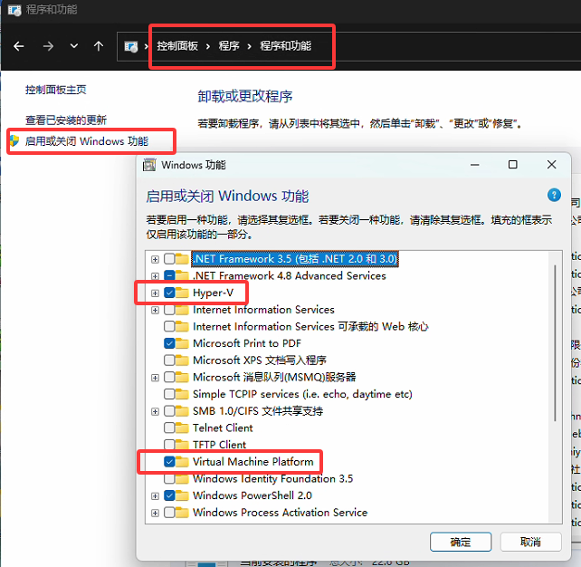 勾選Hyper-V、虛擬機(jī)平臺(tái)、適用于 Linux 的 Windows 子系統(tǒng)。