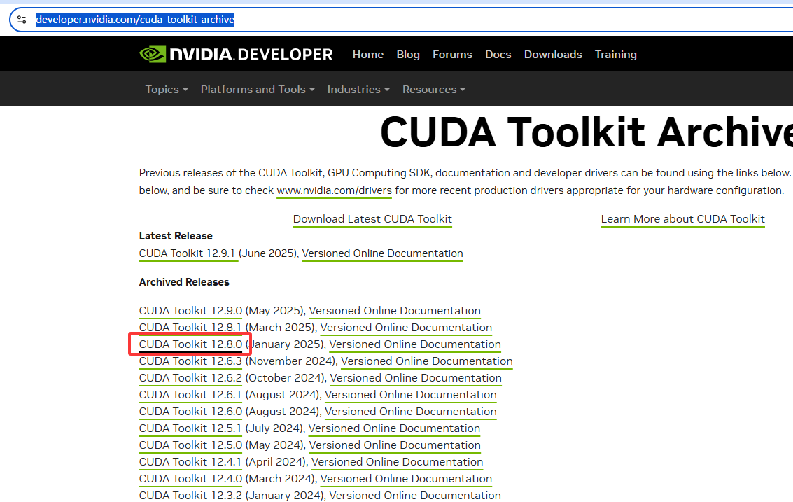 需要說(shuō)明的是由于Nvidia可能會(huì)調(diào)整具體包的子版本號(hào),導(dǎo)致以上部分鏈接可能失效,這時(shí)要在https://developer.nvidia.com/cuda-toolkit-archive頁(yè)面自行選擇適合自己的版本: