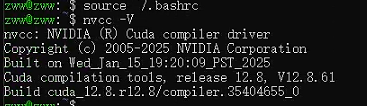 通過(guò)source命令使環(huán)境變量生效,然后即可查看nvcc版本信息。