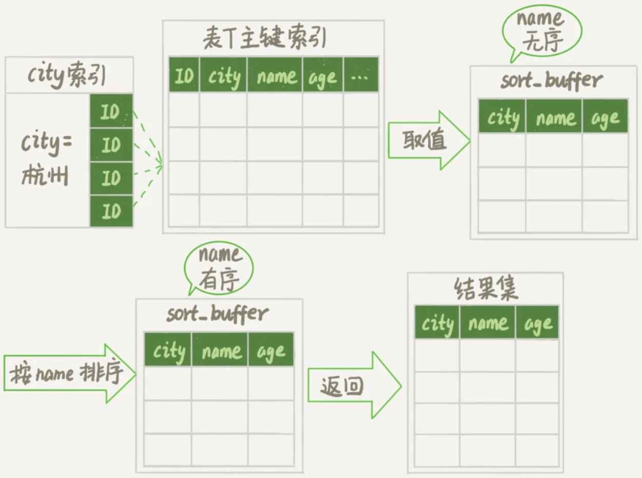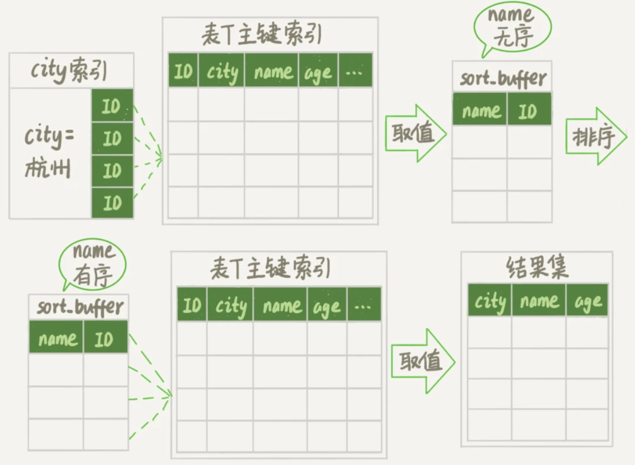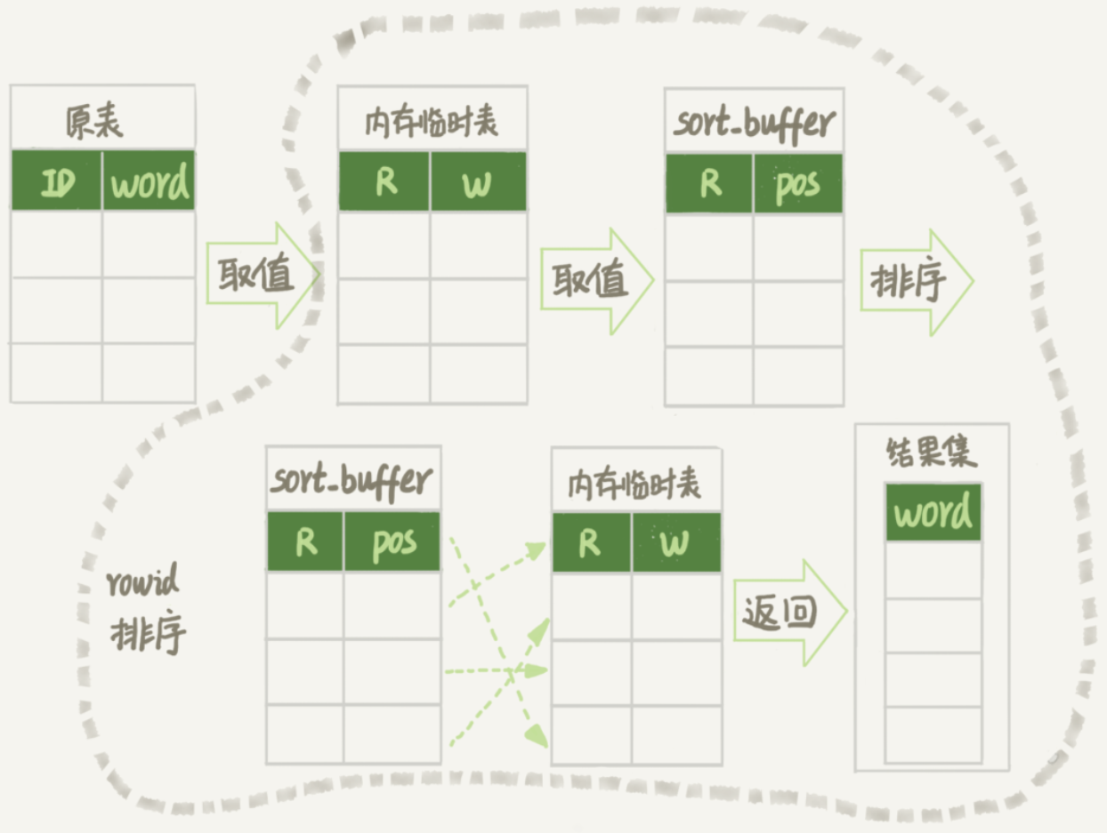 為了更好地分析,這里引用上一篇文章中全字段排序和rowid排序的流程圖: