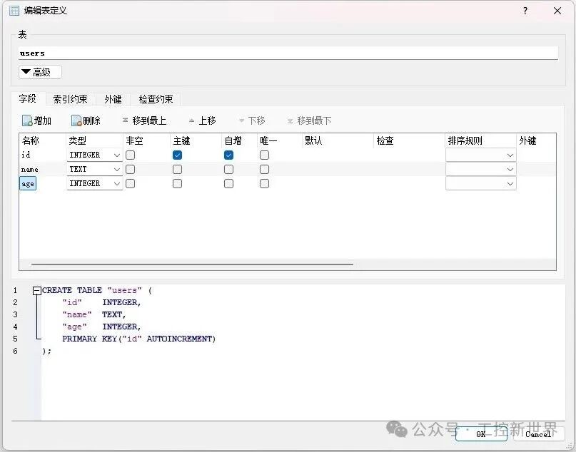 • 如果你希望 id 字段能自動遞增(即每次插入一條新數(shù)據(jù),id 會自動加 1),可以勾選 “自增”(在 id 那一行)。