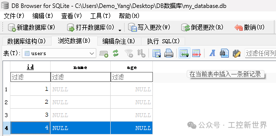 在數(shù)據(jù)表界面中,點擊 "插入一條新記錄" 按鈕。我點擊了4次。