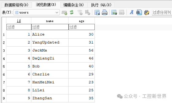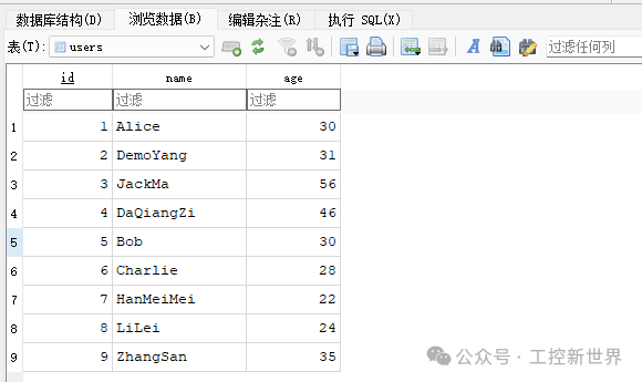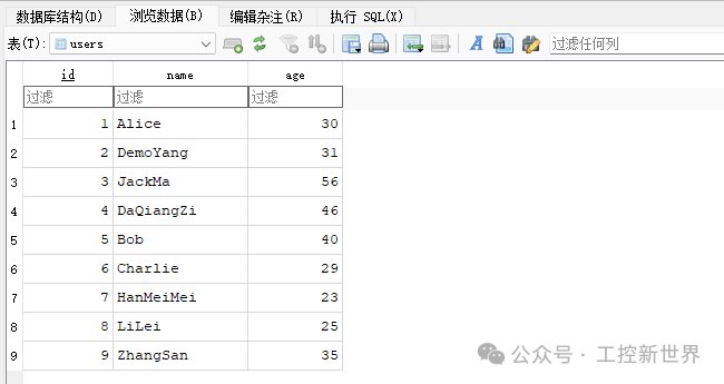 點擊 "數(shù)據(jù)瀏覽" 標簽,選擇你剛創(chuàng)建的表(例如:users)。