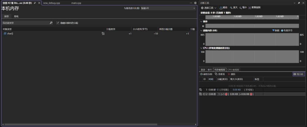 如果我們添加了delete[] p,那就是用完后內(nèi)存就被歸還了。再拍兩次快照,對比差異接近 0,泄漏被修復(fù)。