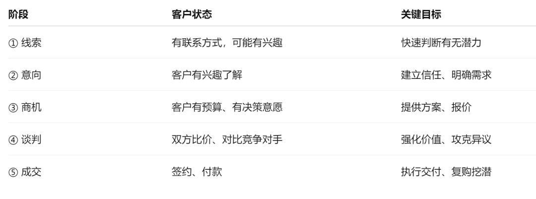 這就是“漏斗”的形狀——越往下越少,漏斗的意義就在于: 讓你知道客戶掉在哪,掉多少,為什么掉。 如果你不看漏斗,所有客戶都堆成一團,你根本分不清問題出在哪個環(huán)節(jié)。 ![]() 02 漏斗的底層邏輯:銷售是過程管理 很多人把銷售當成“個人能力游戲”——誰嘴皮子厲害,誰人脈多,誰關系廣,但優(yōu)秀的企業(yè)早就明白一個道理: 銷售不是玄學,是可管理的過程。 銷售漏斗就是把“成單的過程”拆成一個個可以量化、可以優(yōu)化的階段。我們可以把銷售看成五個階段: ![]() 每個階段都對應不同的動作和策略。如果你不分階段,只知道“客戶很多”,那根本不知道該怎么推進。 而銷售漏斗,就是讓你把客戶分層管理,知道: