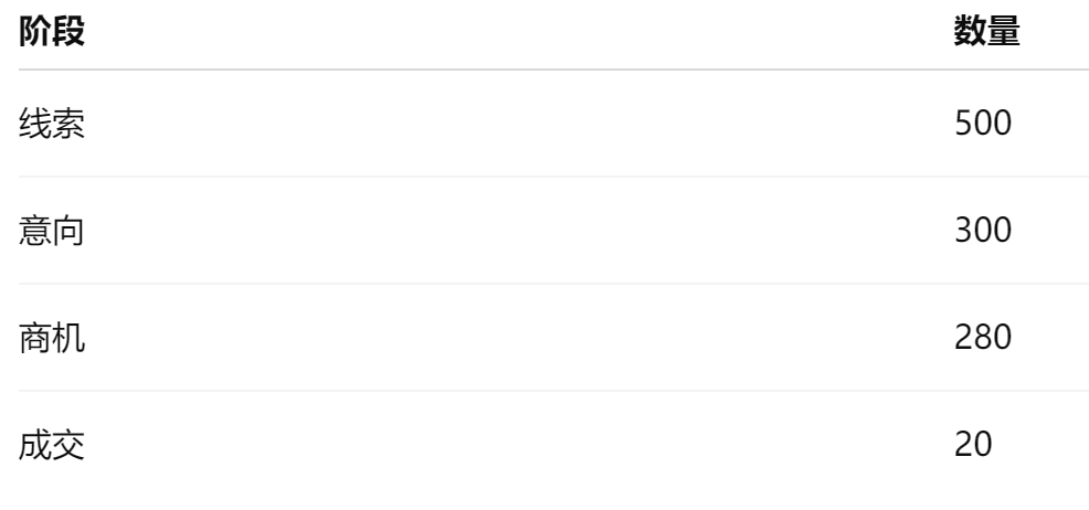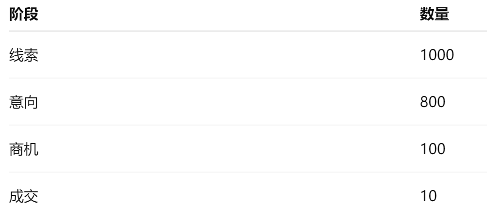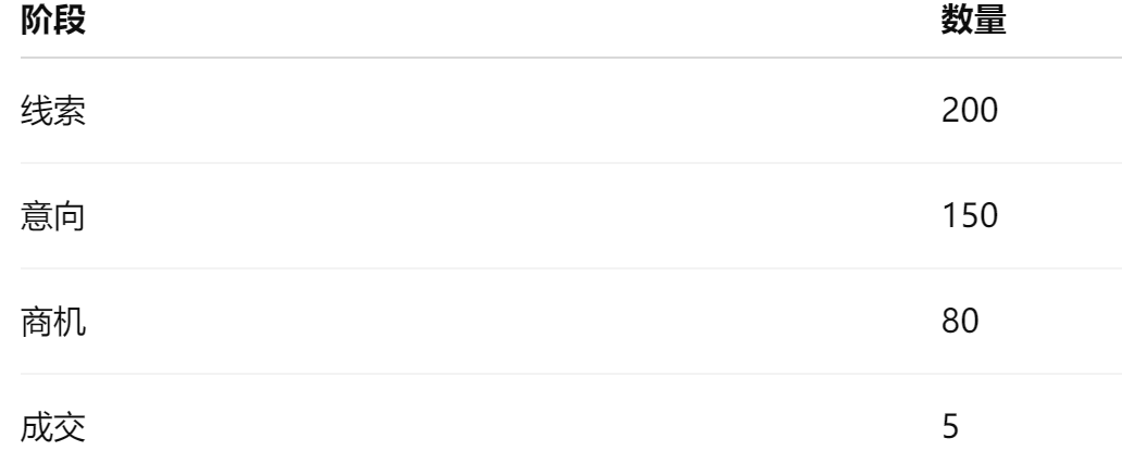 ——但月底一看業(yè)績,啪啪打臉。 漏斗的好處是,它能讓銷售變得可預測、可診斷、可優(yōu)化。 1. 可預測:用漏斗反推業(yè)績目標 假設你歷史數(shù)據(jù)是這樣: