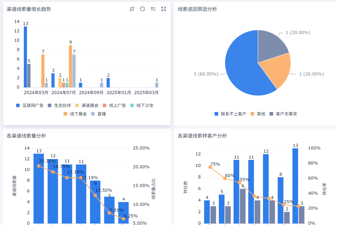 只有分清楚,你的團隊資源、時間和精力才能放在刀刃上。 ![]() 03 為什么線索多但成交少? 舉幾個典型的“漏斗病”。 情況1:上寬中斷 → 跟進不力 ![]() 看起來前期客戶挺多,但掉得太快。說明銷售團隊在“意向轉商機”階段掉鏈子。 原因通常有三個: