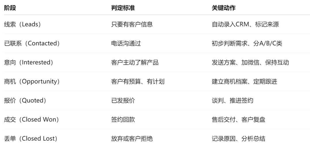 漏斗就像X光,幫你看到銷售體系的骨架。 3. 可優(yōu)化:用數(shù)據(jù)驅動決策 很多公司盲目加人、加預算,其實根本不是人不夠,而是過程效率太低。 比如你發(fā)現(xiàn)意向客戶太多但沒人跟,那不該去招更多銷售,而是該優(yōu)化CRM流程、自動提醒機制。 漏斗數(shù)據(jù)讓管理從“拍腦袋”變成“算出來”。 ![]() 05 銷售漏斗怎么搭才合理? 漏斗不是標準答案,每個企業(yè)都得自己定義階段。舉個B2B銷售漏斗的實用版本 ![]() 關鍵是統(tǒng)一標準。 團隊里每個人都得知道什么叫“意向”,什么叫“商機”。 不然一個人覺得“加微信”算商機,另一個人覺得得“見面”才算——那漏斗數(shù)據(jù)全亂了。 ![]() 漏斗管理落地的三步法 漏斗想真正有用,不是畫圖、喊口號,而是要落地三步走: 第一步:真實的數(shù)據(jù) 這一步是地基。 漏斗數(shù)據(jù)必須真實,否則分析出來全是幻覺。