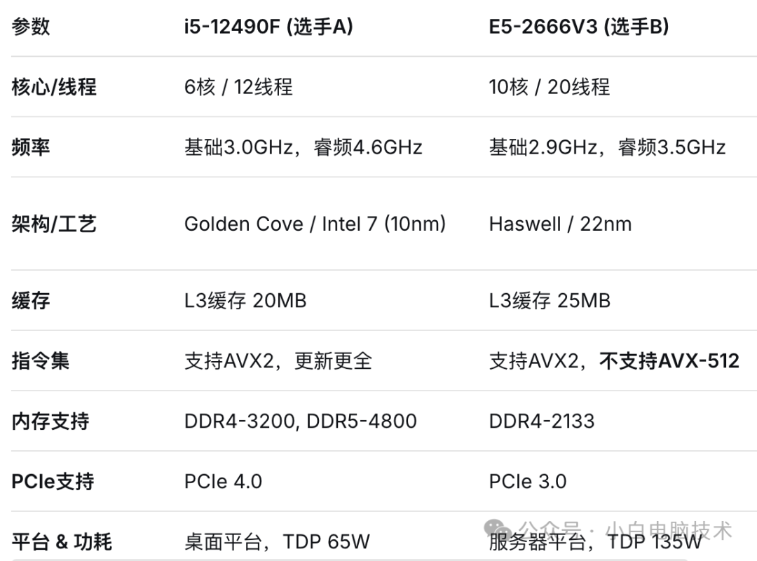 很多朋友在選配電腦時(shí),總會(huì)盯著一個(gè)參數(shù)——CPU。而關(guān)于CPU,最讓人困惑的問題之一就是:“這個(gè)CPU有多少個(gè)線程?是不是線程越多就越牛?” 今天,小白就來講講這個(gè)問題。為了讓大家有最直觀的感受,我們會(huì)請(qǐng)出兩位風(fēng)格迥異的“選手”:酷睿i5-12490F和至強(qiáng)E5-2666v3??赐晁鼈兊膶?duì)決,你自然會(huì)找到答案。 酷睿i5-12490F 至強(qiáng)E5-2666v3 正文開始 如何看CPU參數(shù)? 在對(duì)比之前,我們得先知道參數(shù)中:核心、線程、頻率、指令集、制作工藝、緩存、架構(gòu)這些到底是什么意思。 核心-真正的廚師 可以把CPU想象成一個(gè)廚房,核心就是廚房里的廚師。一個(gè)核心就是一位廚師。理論上,廚師越多,能同時(shí)炒的菜就越多。 核心是物理存在的,是執(zhí)行計(jì)算任務(wù)的真正單位。核心數(shù)量直接決定了CPU的多任務(wù)處理能力。 線程-廚師能同時(shí)做的事情數(shù)量 一位優(yōu)秀的廚師可以“左右開弓”,一邊翻炒A鍋里的菜,另一邊準(zhǔn)備B鍋的調(diào)料。這種“同時(shí)”處理多個(gè)任務(wù)的能力,就是線程。英特爾稱之為超線程技術(shù),讓一個(gè)物理核心能同時(shí)處理兩個(gè)任務(wù)線程。 線程是一種邏輯概念。比如一個(gè)6核CPU,如果支持超線程,那它就能同時(shí)處理6核×2=12個(gè)線程。這能有效提升核心的工作效率,尤其是在多任務(wù)環(huán)境下。 還有大小核的不同,有些小伙伴會(huì)發(fā)現(xiàn)有些CPU是16核24線程,說明其中有8個(gè)大核8個(gè)小核。 頻率-廚師的手速 廚師炒菜的速度有多快?頻率(單位GHz)就是廚師的“手速”。手速越快,單個(gè)菜炒好的時(shí)間就越短。頻率越高,CPU每個(gè)核心執(zhí)行單個(gè)任務(wù)的速度就越快。它很大程度上決定了單核心的性能強(qiáng)弱。 指令集-廚師的菜譜 廚師需要按照菜譜來做菜。指令集就是CPU的“菜譜”,它規(guī)定了CPU能執(zhí)行哪些基本操作。新一代的菜譜(如x86, SSE, AVX2, AVX-512)會(huì)包含更高效、更強(qiáng)大的“烹飪技巧”。 越新、越先進(jìn)的指令集,能讓CPU用更少的步驟完成更復(fù)雜的計(jì)算,尤其在科學(xué)計(jì)算、視頻編碼、AI應(yīng)用中效果顯著。 制作工藝-廚房的精密程度 早期的廚房設(shè)備笨重、占地大、還費(fèi)電?,F(xiàn)在的廚房設(shè)備小巧、精密、效率高。制作工藝(如14nm, 7nm, Intel 7)就代表了制造CPU的精度,單位是納米(nm),數(shù)字越小,工藝越先進(jìn)。 更先進(jìn)的工藝意味著:在同樣大小的芯片里,能塞進(jìn)更多的晶體管(更多/更強(qiáng)的廚師)。功耗和發(fā)熱更低(更省電,制冷壓力?。?。能運(yùn)行在更高的頻率(手速可以更快)。 緩存-廚師的備菜臺(tái) 廚師手邊有一個(gè)備菜臺(tái),上面放著最常用到的食材和調(diào)料,不用每次都跑去遙遠(yuǎn)的倉庫(內(nèi)存)取,大大提高了效率。這個(gè)備菜臺(tái)就是緩存。 緩存是CPU內(nèi)部的高速存儲(chǔ)器,分為L1/L2/L3三級(jí)。容量越大、速度越快,CPU“等”數(shù)據(jù)的時(shí)間就越少,性能發(fā)揮就越充分。 架構(gòu)-廚房的整體設(shè)計(jì) 兩個(gè)廚房,廚師數(shù)量和手速都一樣,但一個(gè)廚房布局合理,動(dòng)線流暢;另一個(gè)亂七八糟,廚師經(jīng)?;ハ鄵趼?。顯然,前者的出菜效率更高。這個(gè)“整體設(shè)計(jì)”就是架構(gòu)。 架構(gòu)是CPU的藍(lán)圖,決定了各個(gè)部件如何協(xié)同工作。架構(gòu)的革新是性能提升最關(guān)鍵的一環(huán)。新一代架構(gòu)通常意味著更高的執(zhí)行效率和更強(qiáng)的性能。 i5-12490F 對(duì)比 E5-2666v3 結(jié)果分析:線程多,真的贏了嗎?E5-2666v3擁有10核20線程,線程數(shù)遠(yuǎn)超i5-12490F的6核12線程。在實(shí)際應(yīng)用中,情況卻不一定了。 游戲性能 絕大多數(shù)游戲?qū)Ω哳l率和新架構(gòu)的依賴度遠(yuǎn)高于核心數(shù)量。i5-12490F憑借其高達(dá)4.6GHz的睿頻和先進(jìn)的Golden Cove架構(gòu),在游戲中的幀數(shù)表現(xiàn)會(huì)遠(yuǎn)遠(yuǎn)甩開E5-2666v3。E5的單個(gè)核心“太慢”,拖了后腿。 日常應(yīng)用與生產(chǎn)力 像Photoshop、Office辦公、網(wǎng)頁瀏覽等應(yīng)用,對(duì)單核性能非常敏感,i5-12490F響應(yīng)更快,體驗(yàn)更流暢。 即使在視頻剪輯、3D渲染等多線程優(yōu)化好的工作中,i5-12490F的架構(gòu)和指令集較新,且單個(gè)核心的效率極高,6核的性能往往不輸甚至超過E5那10個(gè)老舊的核心。再加上對(duì)高速DDR5內(nèi)存和PCIe 4.0 SSD的支持,文件加載和導(dǎo)出速度會(huì)更快。 E5-2666v3的優(yōu)勢(shì)在哪?如果一個(gè)大任務(wù)能拆分成數(shù)十個(gè)甚至上百個(gè)并行小任務(wù),比如虛擬化運(yùn)行大量輕量級(jí)虛擬機(jī)、搭建數(shù)據(jù)庫服務(wù)器、或某些特定的科學(xué)計(jì)算。在這些場(chǎng)景下,E5-2666v3才能被充分利用。 --End-- CPU線程并非越多越好,咱們?cè)诮M裝電腦的時(shí)候需要考慮核心性能與線程數(shù)量。 對(duì)于絕大多數(shù)普通用戶和游戲玩家,咱們應(yīng)該更關(guān)注CPU的架構(gòu)、頻率和單核性能。像i5-12490F這樣的新時(shí)代CPU,即使線程數(shù)不占優(yōu),但憑借架構(gòu)和工藝的“代差”,其綜合體驗(yàn)和性能可以輕松碾壓老款的高線程數(sh