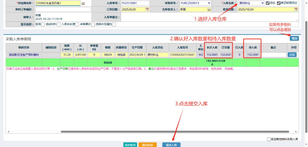 3.點擊入庫后跳轉(zhuǎn)到”新增采購入庫單“頁面,按圖操作:選好入庫倉庫,確認(rèn)好入庫數(shù)量和待入庫數(shù)量,最后點擊提交。 注:如果有多物料的話可以在右上點擊增加。?