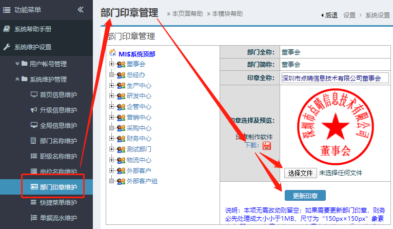 點晴客服: 印章管理位置:系統(tǒng)設置-》系統(tǒng)維護設置-》部門印章維護 ![]() 在以上位置,可以下載印章制作軟件,自行制作所在部門或單位的印章,然后上傳到對應部門,完成綁定。 工藝部曹*華(924853073) 16:51:01 這個印章怎么提交了還是你們原來的印章 無淚止緘(49022925) 17:02:07