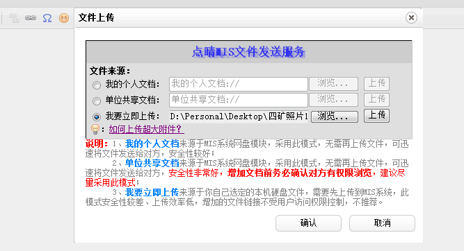 在點(diǎn)晴OA中用WEB方式直接上傳附件(10MB以內(nèi)的附件可以用本方式): ![]() 在點(diǎn)晴MIS信息通PC客戶端中上傳附件(10MB以上的附件建議用本方式,點(diǎn)晴MIS信息通介紹:http://im.clicksun.cn):
