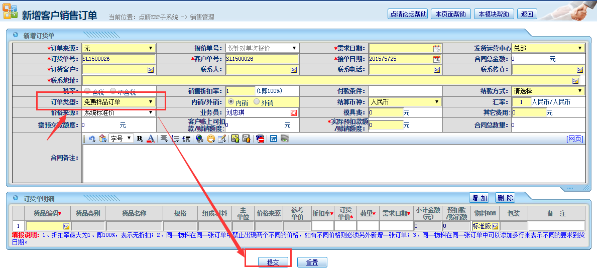 2、下樣品訂單,操作與下達普通單一樣,只是訂單類別選擇免費樣品訂單