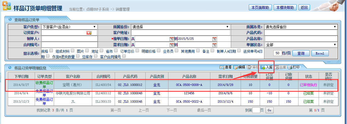 4、樣品入庫,免費樣品訂單可以不用經(jīng)過生產(chǎn),工程人員可以直接在樣品設(shè)計頁面對樣品進行入庫。