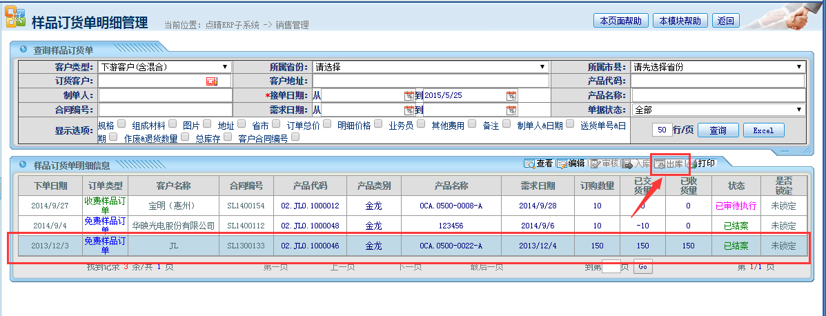 5、樣品出庫,樣品設(shè)計完入庫之后,如果發(fā)貨給客戶后,可以不用去制作送貨單,由工程人員在樣品設(shè)計管理頁面直接做出庫確認(rèn)。選擇要出庫的訂單點擊“出庫”按鈕既可以出庫,前提是樣品已經(jīng)入庫。