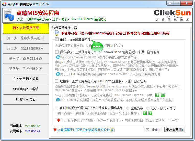 ![]() 下載點晴MIS系統(tǒng)安裝程序(任選一個地址下載即可): 注意: 1、切勿將點晴OA安裝在C盤,一定要安裝在D盤或其他盤。由于Windows系統(tǒng)的C盤是系統(tǒng)盤,整個C盤都有特殊權(quán)限控制,安裝在C盤將導(dǎo)致OA無法正常運行,并且就算設(shè)置調(diào)整后能夠正常運行了,系統(tǒng)中毒或其他原因?qū)е轮匮b系統(tǒng),也會導(dǎo)致OA被徹底破壞!如果采用阿里云/騰訊云/華為云之類的虛擬服務(wù)器,那就必須另外購買數(shù)據(jù)盤,不要直接將點晴OA安裝在系統(tǒng)盤C盤上。如果因為將點晴OA安裝在系統(tǒng)盤C盤導(dǎo)致的異常,請勿詢問如何解決,無法解決! 2、如果OA使用人數(shù)超過10人,應(yīng)該安裝使用SQL Server 企業(yè)版,不要使用免費數(shù)據(jù)庫SQL Server Express版,微軟公司提供的這個Express免費數(shù)據(jù)庫僅用于開發(fā)測試和體驗試用,有諸多限制,可能導(dǎo)致OA使用中頻繁出現(xiàn)瀏覽器頁面白屏之類的多種問題! 3、點晴MIS系統(tǒng)不支持在純局域網(wǎng)內(nèi)安裝和使用,點晴MIS系統(tǒng)安裝和使用過程中都需要連接外網(wǎng),從點晴官網(wǎng)和外部郵局等服務(wù)器上獲取必要的支持性文件及數(shù)據(jù),請確保安裝和使用過程中外網(wǎng)網(wǎng)絡(luò)通暢。如果的確需要僅在純局域網(wǎng)環(huán)境下安裝和使用,請聯(lián)系點晴公司在線客服咨詢提供; 4、Windows電腦上如果安裝了Windows Defender、360安全衛(wèi)士、QQ安全管家之類的安全軟件,則務(wù)必徹底暫停這類安全軟件的運行,否則可能導(dǎo)致安裝過程異常! 5、點晴MIS系列管理信息系統(tǒng)安裝時常見問題匯總: 點晴MIS系統(tǒng)安裝視頻教程: Windows Server 2008/2012/2016/2019 服務(wù)器版上安裝視頻教程 如果暫時沒有Windows Server服務(wù)器環(huán)境,只是想初步了解和簡單體驗一下點晴OA系統(tǒng),也可以在Windows XP/7/8/10/11個人版操作系統(tǒng)上安裝測試體驗系統(tǒng): Windows 7/8/10 個人版操作系統(tǒng)上安裝視頻教程 Windows 11 個人版操作系統(tǒng)上安裝視頻教程 如果在Windows XP/7/8/10/11個人版操作系統(tǒng)上安裝點晴OA測試體驗系統(tǒng)遇到問題無法繼續(xù)時,請勿詢問如何解決(原因說明:http://3992.oa22.cn),請立即準(zhǔn)備一臺電腦安裝Windows Server簡體中文服務(wù)器版操作系統(tǒng)后,再安裝點晴OA系統(tǒng),一定可以!