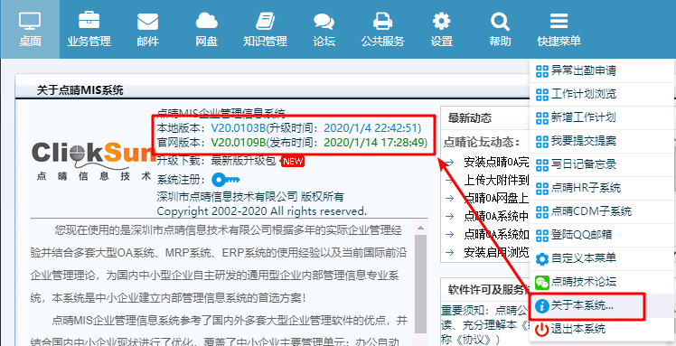 點(diǎn)擊點(diǎn)晴OA快捷菜單-》關(guān)于本系統(tǒng),進(jìn)入以下界面: