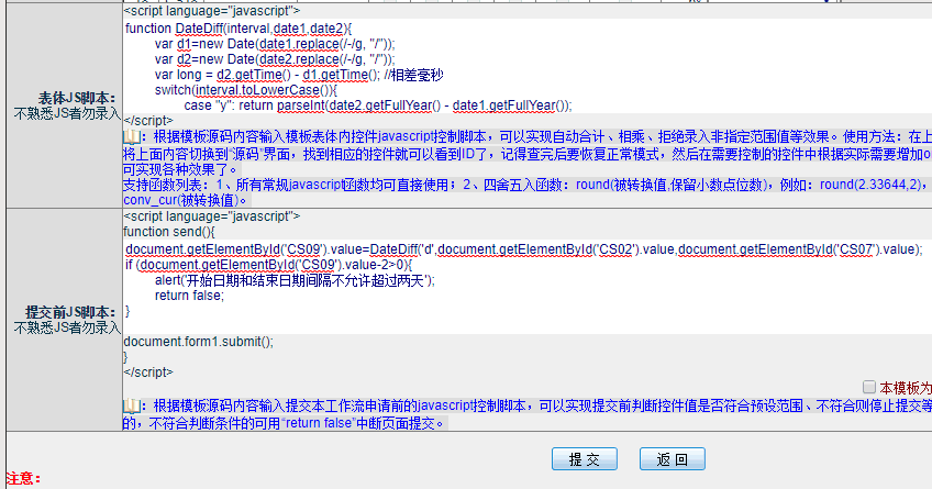 然后在表體JS腳本中輸入日期相隔時(shí)間函數(shù):